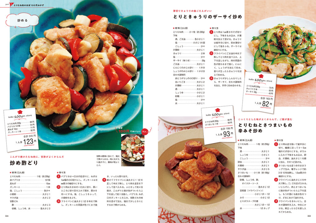 都内スーパーで実際に編集部員が調査した食材の価格表(セール価格含む)を掲載しており、さらに各レシピページには、使用する食材(調味料と少量の香味野菜などは除く)の材料費を「レシート」形式で表記しているので、ほぼ100円の内訳がわかりやすいですよっ。